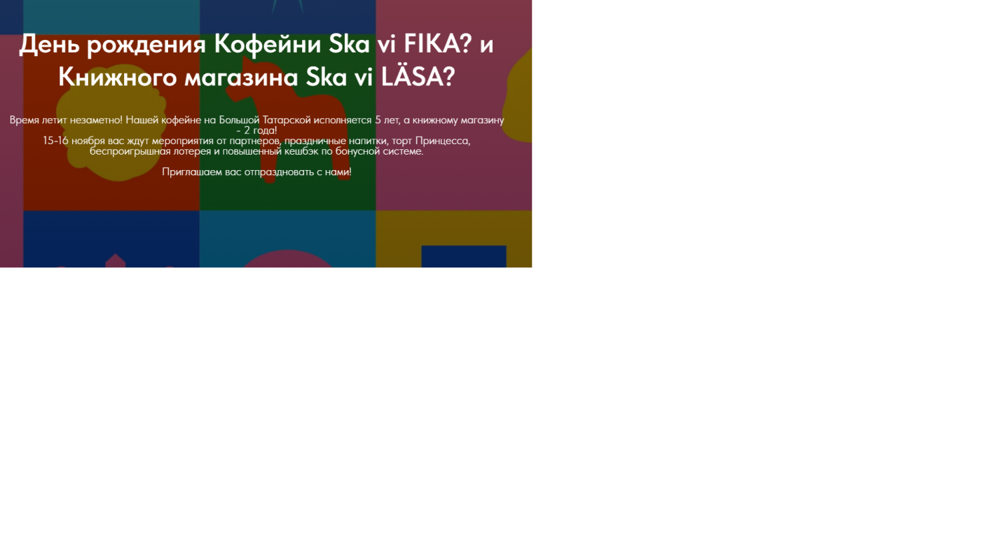 Время летит незаметно! Нашему Партнёру — Кофейне «Ska vi FIKA? » на Большой Татарской исполняется 5 лет, а книжному магазину «Ska vi LÄSA» — 2 года. Спасибо литературном клубу «Сокровища севера», где обсуждаются книги скандинавских авторов. Тепло принимали здесь и «Камни говорят» Тоурбергюра Тоурдарсона в переводе Андрея Мельникова и «Первый грамматический трактат » под редакцией Дарьи Глебовой и Фёдора Успенского и «ЭДДУ.Песни о богах и героях» в переводе Софьи Свириденко…