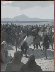 Но Аусгримюра Йоунссона (Ásgrímur Jónsson, 1876-1958) им отведена важная роль в сложных обстоятельствах, в данном случае во время извержения вулкана. Йоунссон, неоднократно становившийся свидетелем извержений вулканов, создал около 60 работ с такими сценами: большие живописные полотна, акварели, рисунки, эскизы. Самые ранние датированы 1904-1908 годами, но большинство созданы в 1945–1957 годах. Часто на переднем плане он помещает перепуганных людей и животных. Причем лошади здесь представлены не просто как помощники людей, но и такие же жертвы трагических событий.