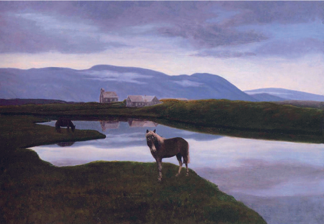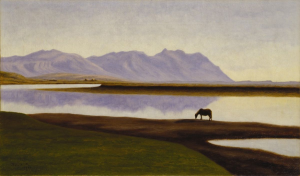 В 1900 году в Рейкьявике состоялась выставка Тоурарина Торлакссона (Þórarinn B. Þórláksson (1867–1924), которая стала первой выставкой современного исландского художника на родине (до этого исландские художники выставляли свои работы преимущественно в Копенгагене). Выставка стала поворотным моментом в истории страны: если до этого Исландия была литературной страной, то теперь должна была стать страной со своим национальным искусством. Художникам, как выразился лауреат Нобелевской премии Халлдор Лакснесс, нужно было «создать новый визуальный мир для своего народа». Основой этого визуального мира стал идеализированный лирический пейзаж, в котором отражались особый, уникальный ландшафт и свет Исландии. Торлакссон, которого впоследствии назовут «отцом исландской пейзажной живописи», представил тогда на выставку 30 работ, 9 из которых изображали виды важнейшего для исландцев места – Тингвеллира (Þingvellir). Это безмятежные пейзажи с широким горизонтом, окутанные светом летней ночи и написанные бесчисленными оттенками синего цвета. Такой холодный голубой колорит надолго закрепится в исландской пейзажной живописи. В некоторых работах Торлакссона встречаются и лошади, которые, написанные теми же красками, что и окружающий их пейзаж, являются неотъемлемой частью ландшафта, но с другой, становятся воплощением исландской природы – красивой, непредсказуемой, дикой и свободной.