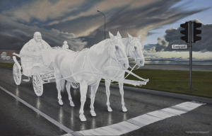 Лошади неожиданно появляются и в творчестве писателя и художника Хатльгрима Хельгасона (Hallgrímur Helgason, р. 1959). Эта работа с интересной историей. В 2007 году, за год до экономического кризиса в Исландии, в Рейкьявике состоялся ужин и аукцион по сбору средств для ЮНИСЕФ. Среди лотов, выставленных на продажу была и работа Хельгасона – пустой холст, для которого покупатель сам мог выбрать сюжет. В результате «картина» Хельгасона, проданная за рекордные 200 000 евро, стала самым дорогим лотом того вечера и самым дорогим произведением современной исландской живописи. В течение двух лет он раздумывал над сюжетом и в результате написал напоминающее Будду божество, проезжающее на конной повозке по улицам Рейкьявика.